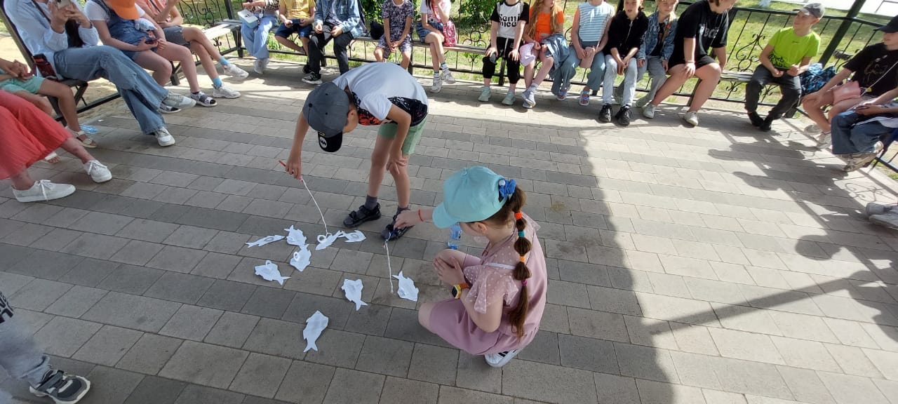 На летних площадках регулярно повторяются правила техники безопасности, как вести себя на водоёмах. Дети играют в "рыбалку". Ловят рыбок и читают правила безопасности.