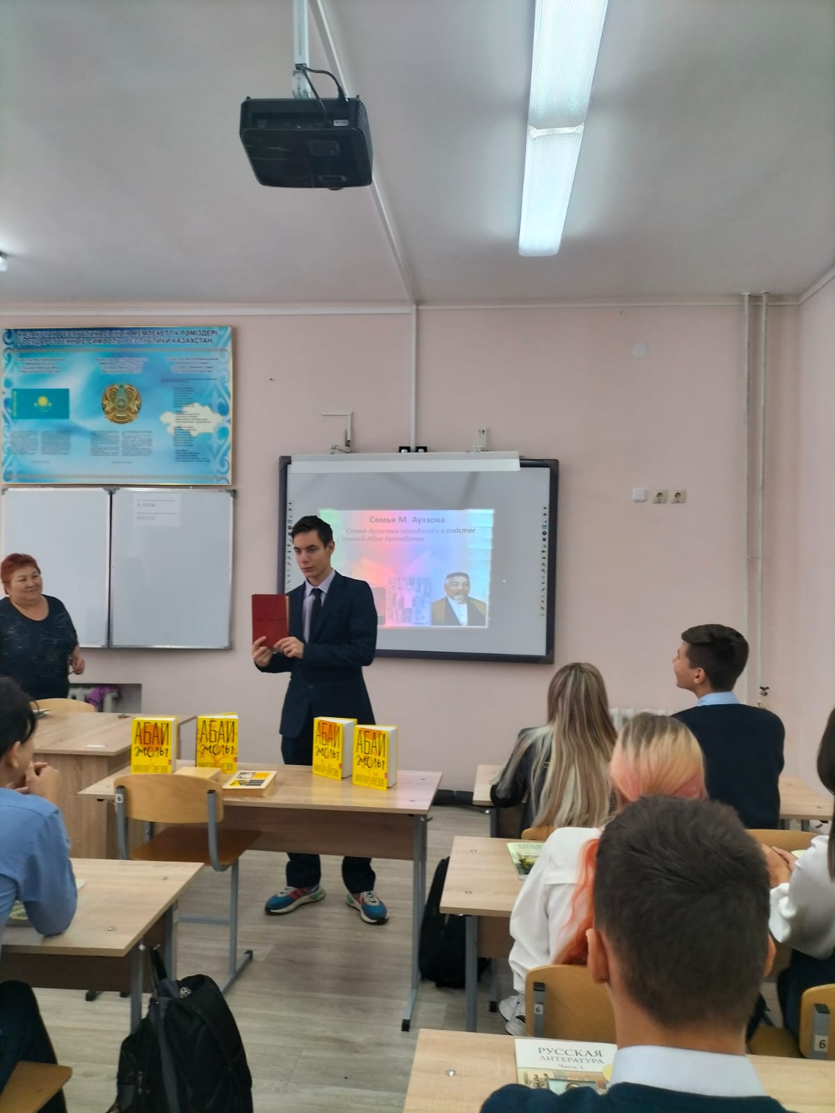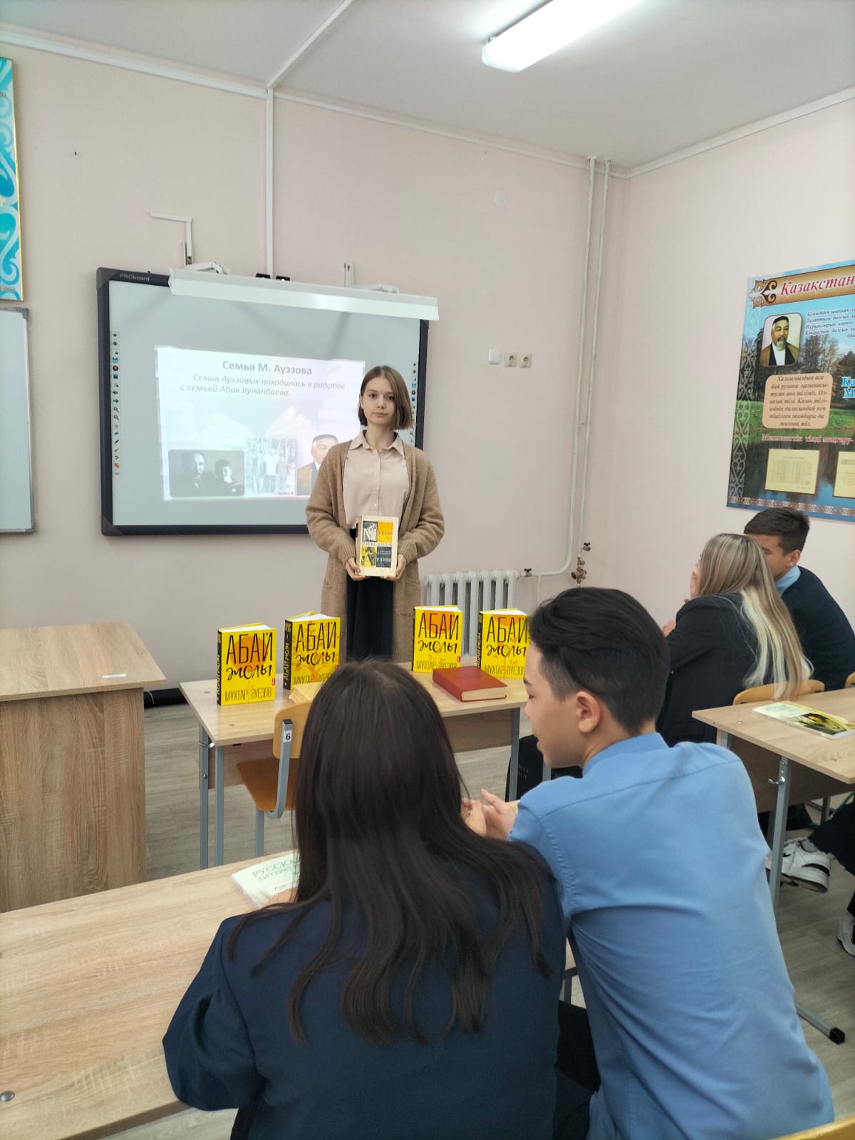 Мұхтар Әуезов қазақ халқының қазіргі тарихында, оның мәдениеті мен әдебиетін дамытуда ерекше орынға ие. Керемет ақыл, энциклопедиялық білім, талант, көзқарастардың кеңдігі және үлкен адамгершілік – бұл жазушыны сипаттайтын керемет қасиеттер. Іс-шара барысында балалар М.Әуезовтің өмірі, шығармашылығы, жазушының қиын және даулы тағдыры, оның қоғамдық қызметі, "Абай жолы"романы туралы бейнеролик көрді