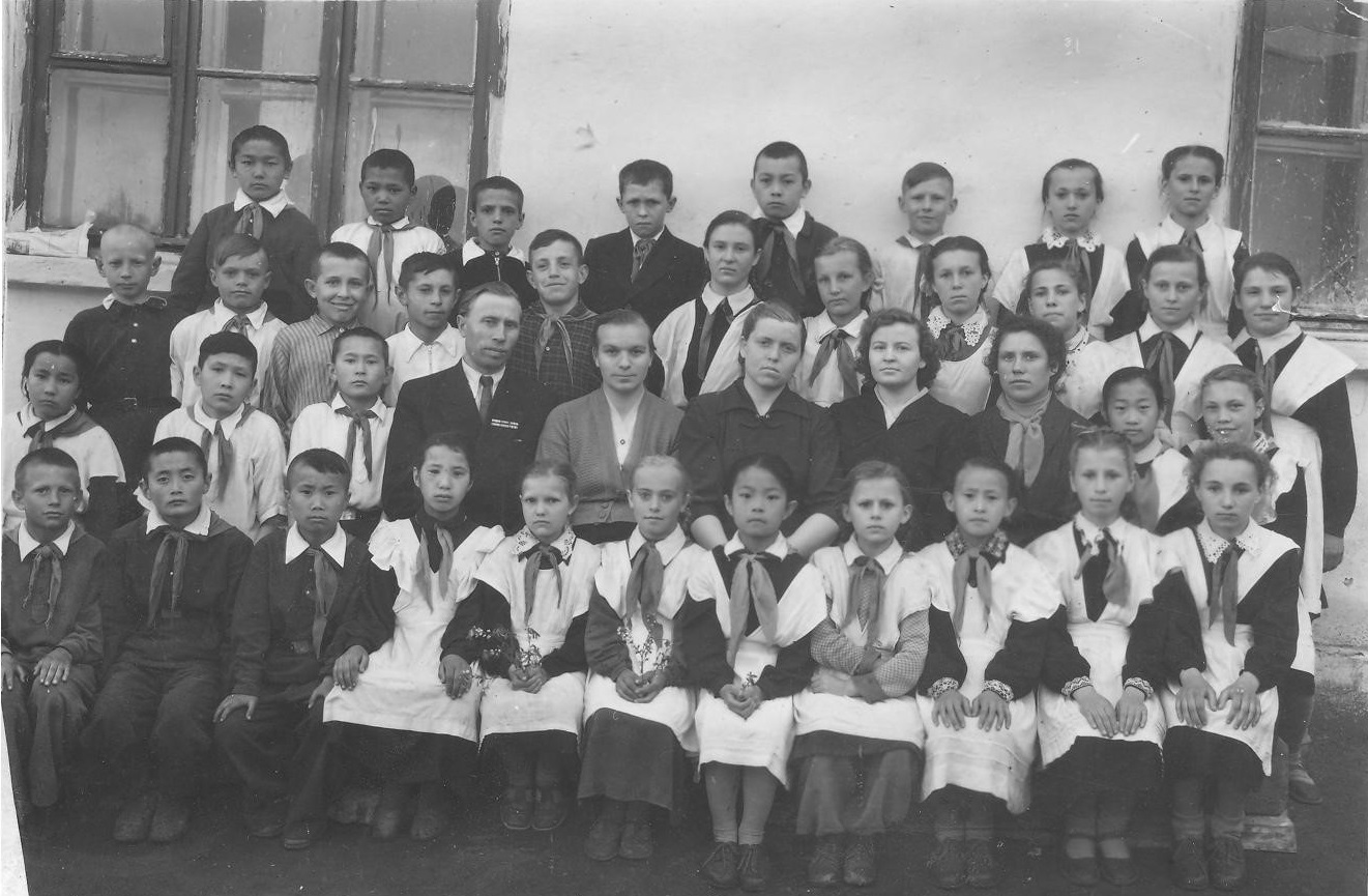 В 1954 году население посёлка увеличилось. Начальная школа была преобразована в семилетнюю. Первых выпускников школа выпустила в 1957 году. Седьмой класс тогда закончили 4 ученика - Полусмяк Валентина, Ким Сергей, Ким Николай, Кондратенко Юрий. Число выпускников с каждым годом увеличивалось. В 1959 году школу закончили 6 учащихся. В 1960 году-9, в 1961 году-20 учащихся. Директором школы тогда был Водясов Виктор Яковлевч, завучем-Гадецкая Зоя Матвеевна. Из маленького домика школу перевели в двухэтажное здание в центре посёлка. К этому времени МТС была реорганизована в совхоз, крупное зерновое хозяйство. Население росло, увеличивалось число детей. Уже и это двухэтажное здание оказалось мало..