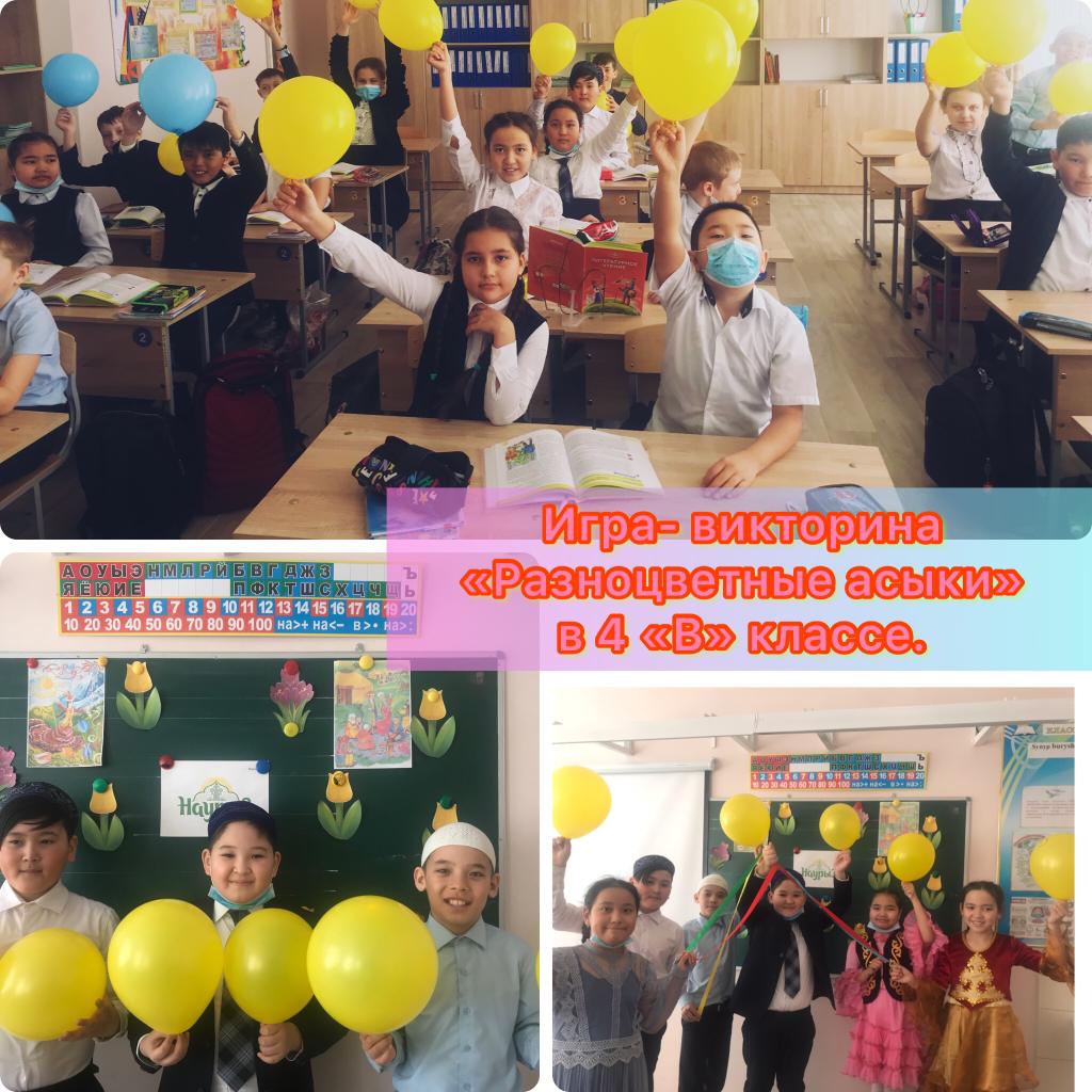 Затем была проведена групповая работа, где учащиеся разбились на три группы и провели игру «Разноцветные асыки» на знание истории праздника, традиций и обычаев народов Казахстана, на быт и культуру казахского народа. Заключительным этапом классного часа, было проведение рефлексии. Дети писали на тюльпанах поздравления и пожелания. Были проведены традиционные игры